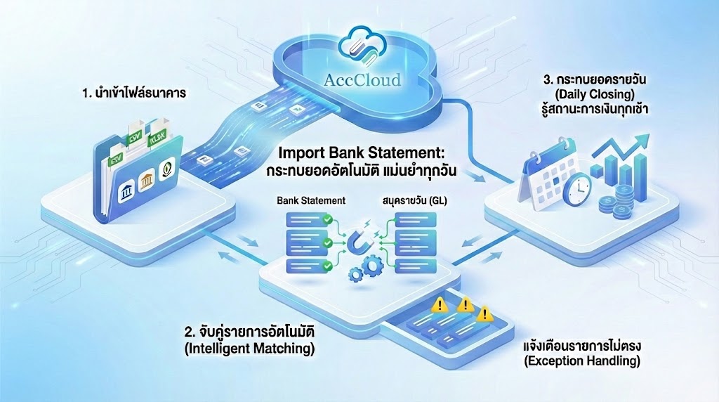 ในระบบ AccCloud เรามีฟีเจอร์ที่สามารถ Import Bank Statement จากไฟล์ของธนาคาร เข้ามาเทียบกับรายการในสมุดรายวัน (GL) ได้อย่างชาญฉลาด