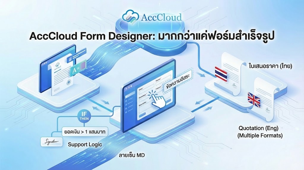 จุดเด่นของ AccCloud คือเราไม่ได้ให้แค่ฟอร์มสำเร็จรูปที่แก้ไขไม่ได้ แต่เรามีเครื่องมือ Form Designer ที่ทรงพลัง